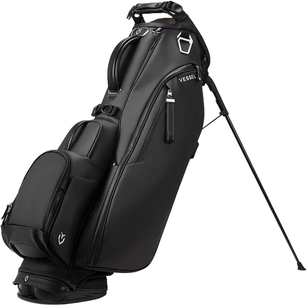 Vessel has done it again with a Tour-grade synthetic leather carry bag receiving rave reviews. There’s a choice of a 6-way top (6.6 lbs.) with 3 full-length dividers or a 14-way (6.95 lbs.) with 14 dividers and the special strap attachment design prevents clubs falling out and better carry balance. Vessel is known for their attention to detail such as the Player V Stand Bag ($439) has a cart strap pass through and nine pockets. Player V Golf Stand Bag | Premium Golf Bag – Black